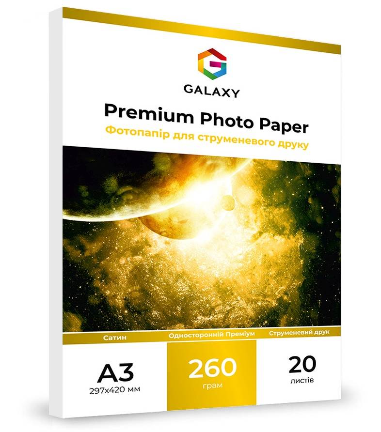 Преміум фотопапір Galaxy А3 (20л) 260г/м Сатин має високу щільність листа і має особливі характеристики, які виділяють його серед усіх інших видів паперів. Даний папір має мікропористу багатошарову структуру завдяки чому чорнило миттєво вбирається і швидко закріплюється не розтікаючись по поверхні листа, а верхній шар паперу має спеціальний поліестровий шар, який не дає листу деформуватися і коробитися навіть при попаданні вологи.