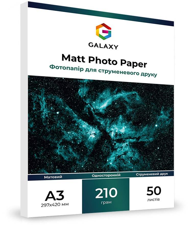 Матовий фотопапір Galaxy А3 (50л) 210г/м2 має невелику щільність що дозволяє використовувати його для всіляких цілей, від друку фотографій у рамку до всіляких репродукцій, фотокниг, рекламної продукції, візиток та інших друкованих матеріалів з максимальною промальовуванням деталей зображення.