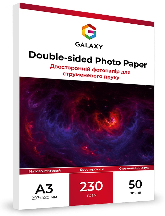 Двосторонній матово-матовий фотопапір Galaxy А3 завдяки своїй матовій поверхні менш схильний до механічних пошкоджень, також не бликує на сонці і відбитки зображень виходять високого контрасту з відмінною деталізацією.
