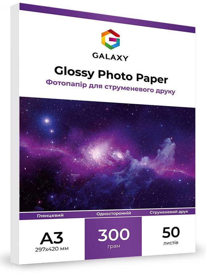 Відмінною особливістю глянцевого фотопаперу Galaxy формату A3 є гладка поверхня листа з глянцевим блиском, також вона має високий ступінь білизни і відмінну стійкість до вицвітання фарб, все це підтверджує високу якість даного паперу.