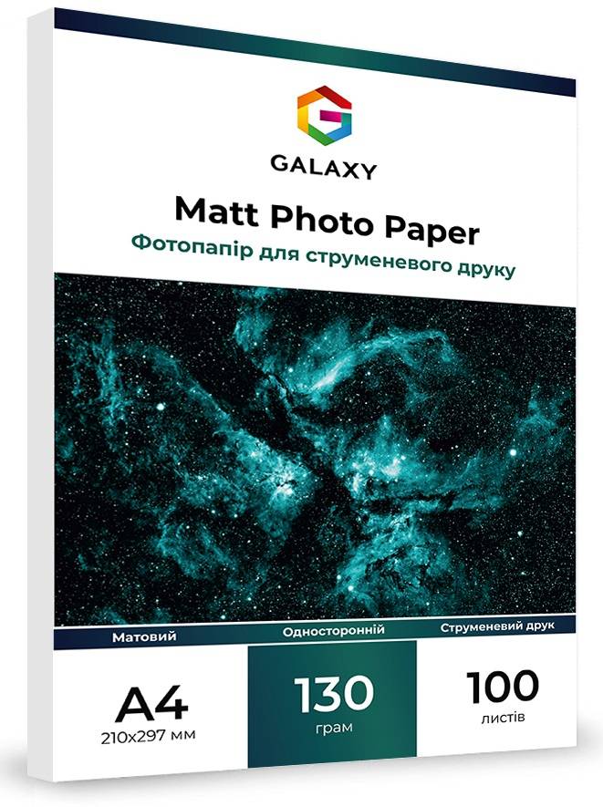 Матовий фотопапір Galaxy А4 (100л) 130г/м2 має невелику щільність що дозволяє використовувати його для всіляких цілей, від друку фотографій у рамку до всіляких репродукцій, фотокниг, рекламної продукції, візиток та інших друкованих матеріалів з максимальною промальовуванням деталей зображення.
