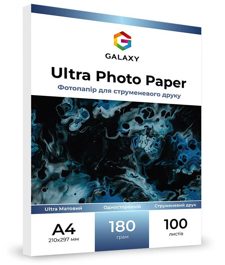 Ультра матовий фотопапір Galaxy завдяки середній щільності 180 г/м2 чудово підходить для друку фотографій, обкладинок, плакатів, афіш, календарів, листівок, флаєрів та будь-яких інших зображень з максимальною якістю промальовування деталей на рівні до 2880dpi. Друкувати зображення на цьому папері можна будь-яким струменевим принтером. Найкраще підійдуть оригінальні або сумісні чорнила на водній основі ТМ Galaxy. -