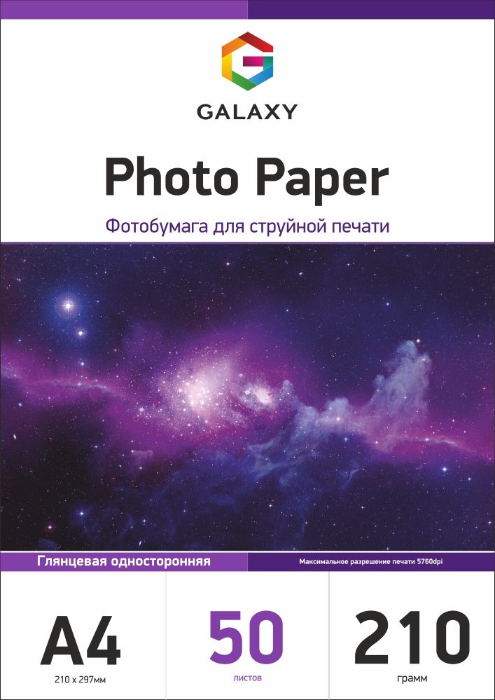 Відмінною особливістю глянцевого фотопаперу Galaxy формату A4 є гладка поверхня листа з глянцевим блиском, також вона має високий ступінь білизни і відмінну стійкість до вицвітання фарб, все це підтверджує високу якість даного паперу.