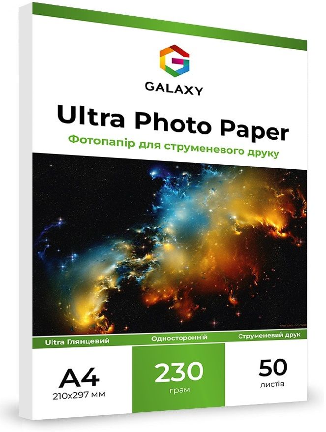 Головні переваги фотопаперу А4 (50л) Galaxy з поверхнею ULTRA глянець у порівнянні зі стандартним глянцевим папером є: більш високий рівень білизни, покращені показники вбирання та закріплення чорнила на поверхні, за рахунок чого вицвітання з фото відбувається значно повільніше. Також відмінною особливістю покриття Ultra глянець є однорідна гладка поверхня листа з глянцевим блиском.