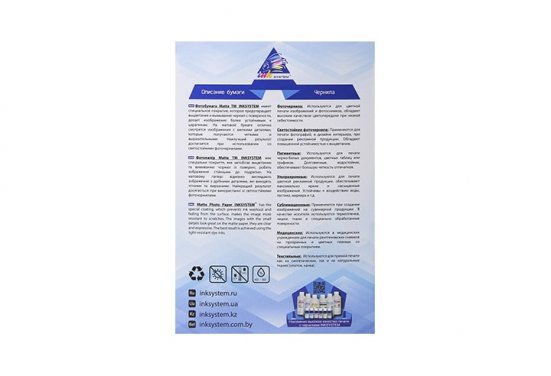 Матовий фотопапір Inksystem має матову поверхню, завдяки цьому під час друку фотографій зображення виходить максимально реалістичними з яскравими та насиченими кольорами, що передають всю градацію кольорів та відтінків. Для матового фотопапіру Inksystem із щільністю 230 грам, найкраще підійдуть водорозчинні чорнила (сумісні або оригінальні). Завдяки якісному зовнішньому матовому шару чорнило швидко вбирається і не змащується після друку, і так як щільність паперу досить висока, після друку лист не буде скручуватися і збереже свою структуру.