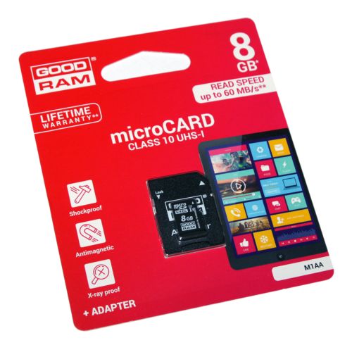 Об'єм пам'яті флеш 8 ГБ Бренд Goodram Клас Class 10 UHS-I Файлова система FAT 32 Артикул виробника M1AA-0604R11 -