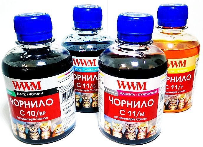 Комплект водорозчинного чорнила WWM C11 CANON (B/C/M/Y) 4x200г були спеціально розроблені для 4-х кольорових принтерів та МФУ Canon (Кенон) моделей: Pixma IP, IX, MP, MX MG. Характеристики даної серії чорнила WWM повністю відповідають вимогам необхідним для повноцінної роботи фотопринтерів та МФУ наведених вище моделей. При цьому чорнило можна заливати як у картриджі так і в СНПЧ