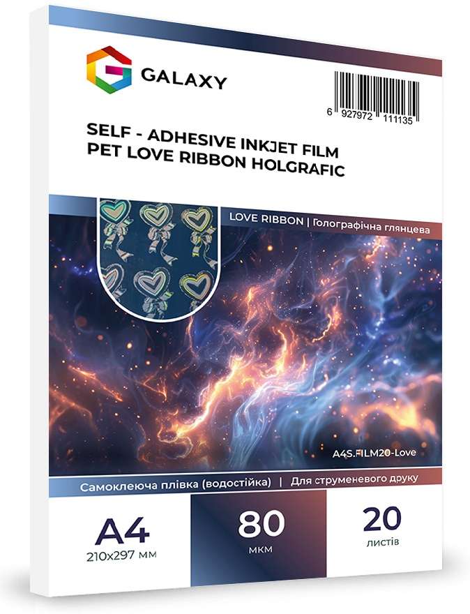 Самоклеюча плівка Galaxy А4 (20л) 80мкм, Струменевий друк, Holographic LOVE RIBBON