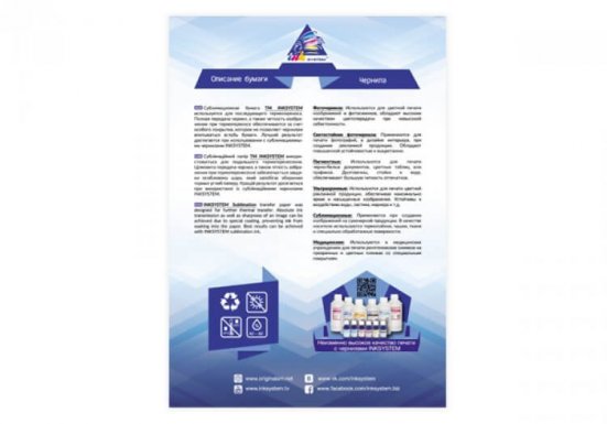 Сублімаційний папір INKSYSTEM призначений для термічного перенесення сублімаційних чорнил з поверхні паперу безпосередньо на синтетичні тканини, кераміку, метал. Поверхня сублімаційного паперу INKSYSTEM виготовлена таким чином, що при друку зображення в принтері вона слабо вбирає чорнило (дозволяючи щоб зображення практично повністю перейшло в тканину, або в полімерний шар фотокераміки кухлів, тарілок), при цьому час висихання її залишається найменшим.